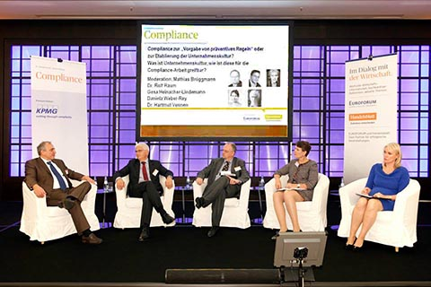 Podiumsdiskussion auf der Compliance Tagung. Teilnehmer (v. l. n. r): Dr. Rolf Raum, Dr. Hartmut Vennen, Matthias Brüggmann, Daniela Weber-Rey, Gesa Heinacher-Lindemann, LL.M. (@EUROFORUM/ Constantin Meyer)